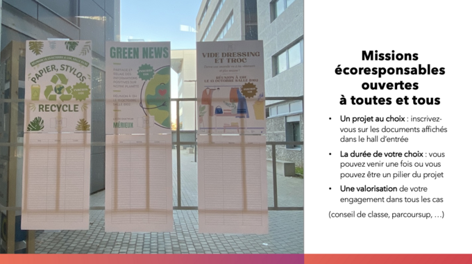 Par CORINNE PERRET-THOMAS, publié le samedi 4 octobre 2025 18:20 - Mis à jour le lundi 6 octobre 2025 20:31Plusieurs missions éco-responsables sont proposées au lycée : participation ponctuelle ou de longue durée sur le projet qui vous plaît | Réunion le lundi 13/10 à 13h en salle B102 -