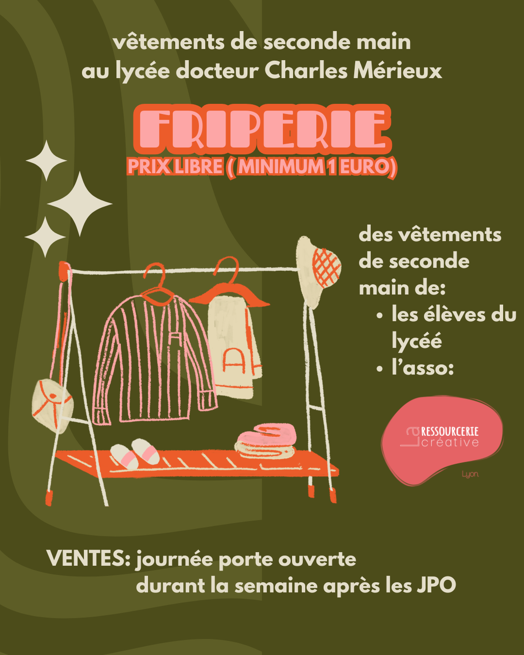 La friperie des éco-délégué·es organise une vente de vêtements de seconde main le samedi 28 mars durant la Journée Portes Ouvertes et toute la semaine suivante. Le prix d'achat est libre (minimum 1 euro) et les vêtements proposés proviendront soit des dons des élèves du lycée soit du partenariat avec l'association locale La Ressourcerie créative.