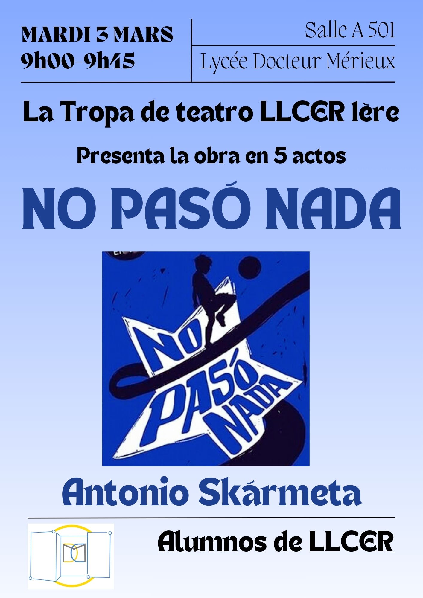 Los alumnos de LLCER han adaptado una obra de teatro a partir de la lectura de obligatoria de la novela corta "No pasó nada" de Antonio Skármeta. Aquí nuestra invitación para los alumnos de LLCER Tle y para quienes quieran acompañarnos.